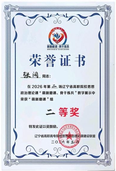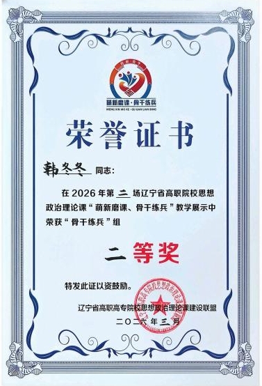 近日,2026年第二场辽宁省高职高专院校思想政治理论课“萌新磨课、骨干练兵”教学展示决赛圆满落幕。伟德官网思政教研部教师张阔、韩冬冬凭借扎实的专业功底与精巧的教学设计,分别斩获“萌新磨课”组二等奖、“骨干练兵”组二等奖,为学校赢得荣誉。