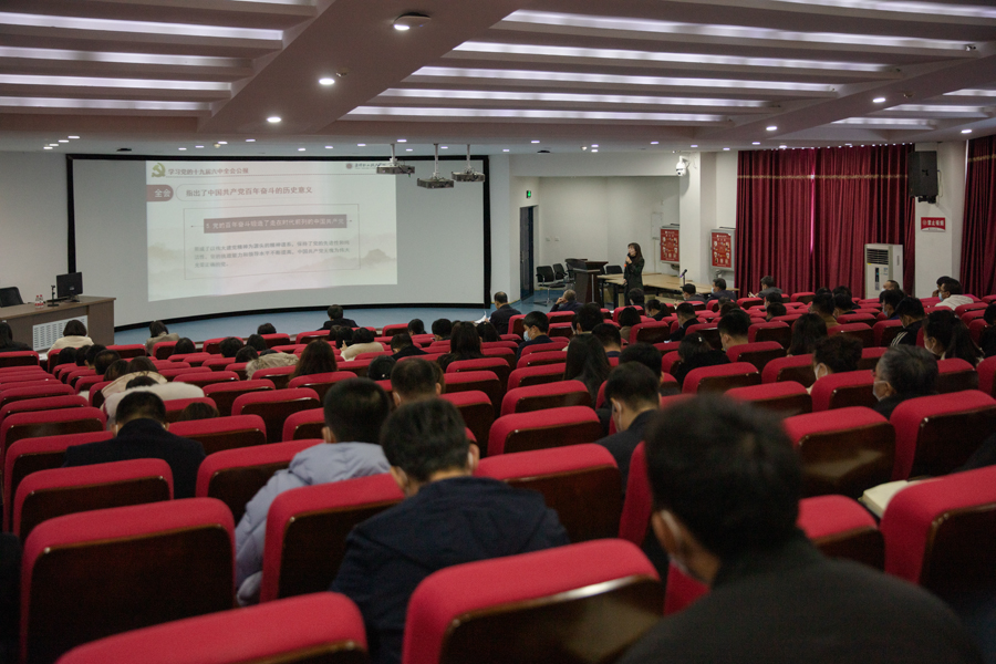 思政部李微老师就学习党的十九届六中全会精神围绕三个“需要”、四个“时期”(伟大飞跃)、两个“确立”、五大“历史意义”、十个“坚持”、牢记一个“根本问题”、四个“必须”一次“非常重要的代表大会”和一个“号召”九个关键词进行专题辅导。