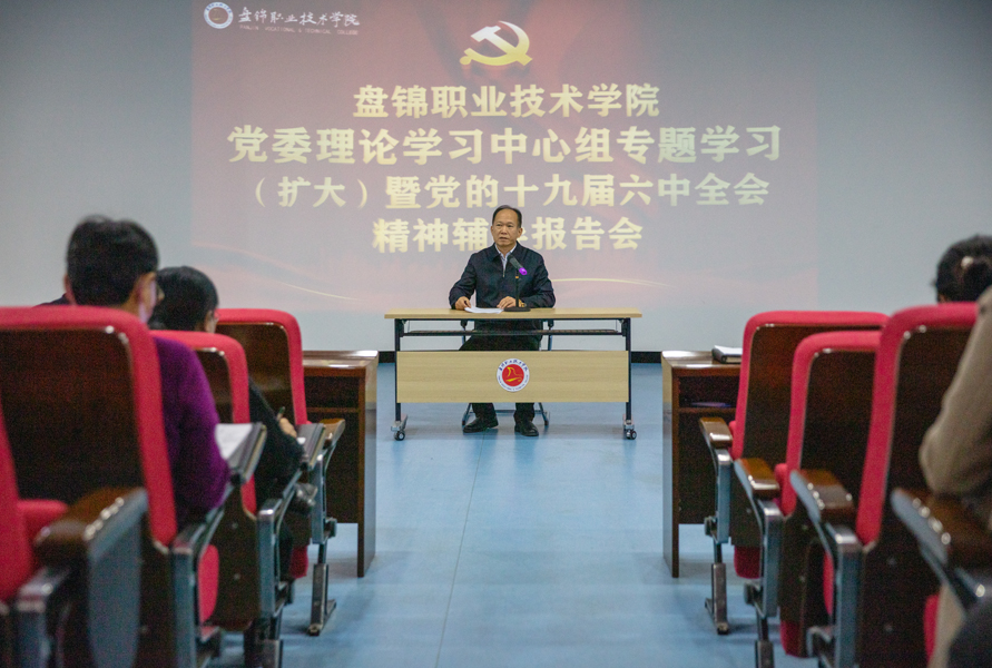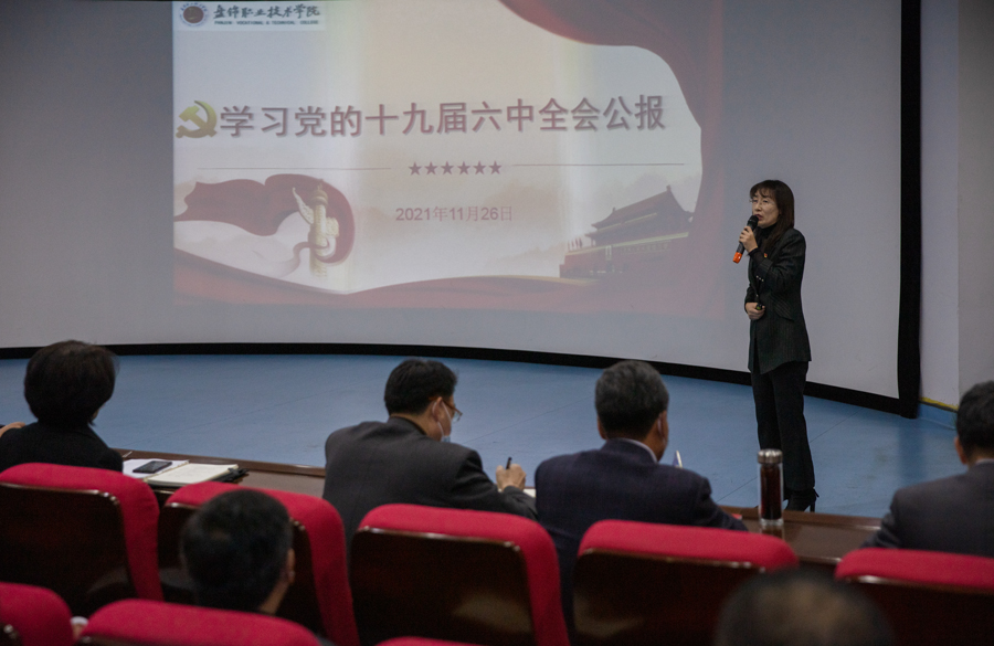 11月26日上午,学校在博远楼103会议室召开党委理论学习中心组专题学习(扩大)暨党的十九届六中全会精神辅导报告会。思政教研部李微老师在会上进行专题辅导。报告会由学校党委副书记李兵主持并对抓好学习宣传贯彻党的十九届六中全会精神作出部署。在校领导李辉、勾殿红、张洪福、周羽、李冬,市管干部刘艳出席。学校全体中层干部、思政课教师、辅导员、党外人士代表和学生代表参加会议。
