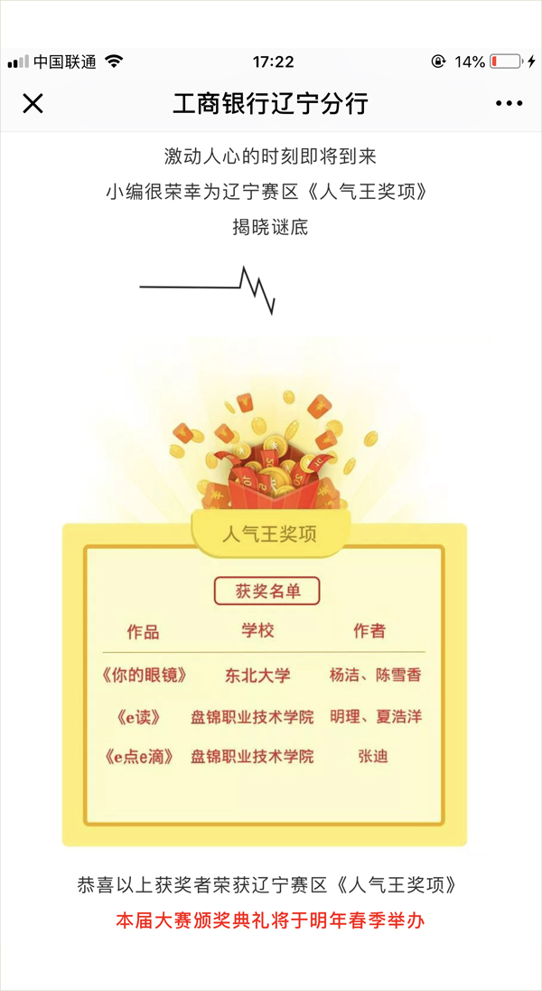 通过参加此次比赛,极大地展现了我院学生敢于点燃梦想的青春风采、严谨求实的科学精神、创新实干的担当精神。也以较强的实力展现了我院学生的创新思维和创新能力,更充分展现了我院以能力为本位的项目化课程改革成果。同时,参赛的组织效果、作品水平得到了中国工商银行辽宁省分行、盘锦市分行领导和专家的一致好评。今后,学院财经分院将组织更多的同学设计更好的作品,参与到金融创意活动中。