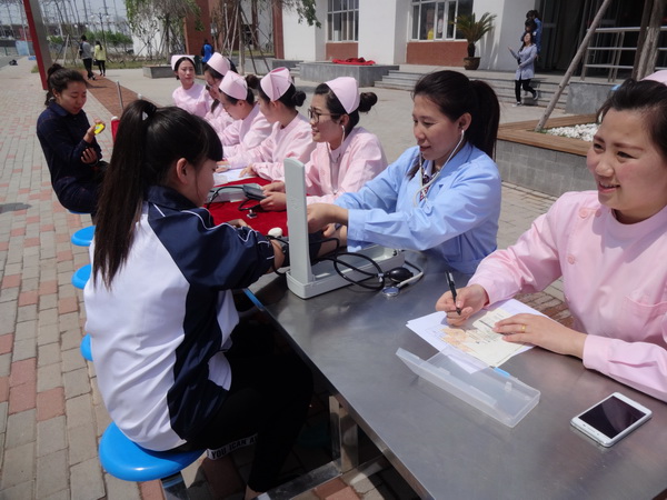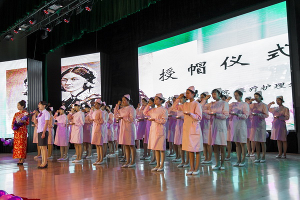 本次庆祝活动共分为测量血压,血糖等义务活动、授帽仪式、“天使风采”文艺演出等三大部分。测量血压、血糖等义务活动于5月12日中午在我院的第一食堂和教工食堂进行,由医疗护理分院的部分老师和同学们身着整洁的护士服,手拿测试仪器和记录单为部分师生进行血压、血糖及身高体重等项目的测定,并热心的对同学们进行了健康知识的宣传和讲解。一群衣着整洁的白衣天使,像一朵朵竞相开放的花儿,成为了校园内一道亮丽的风景线。