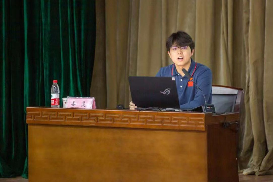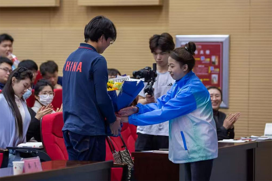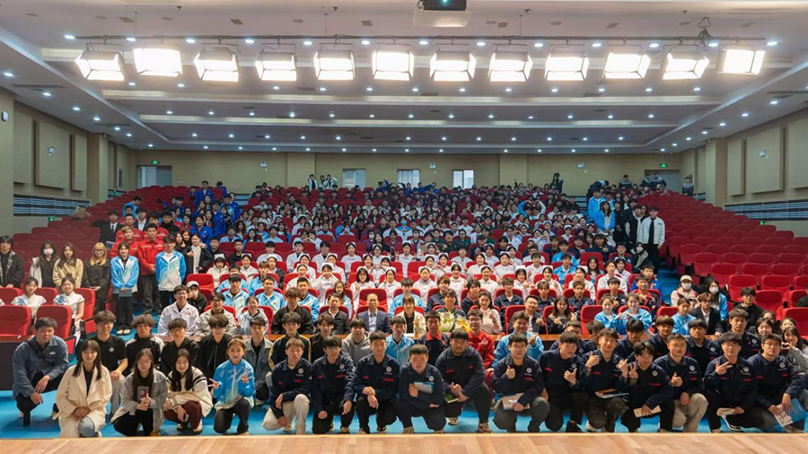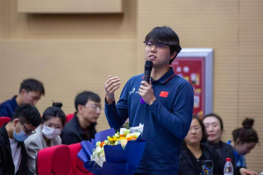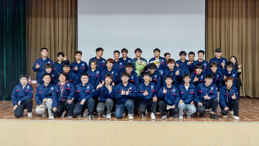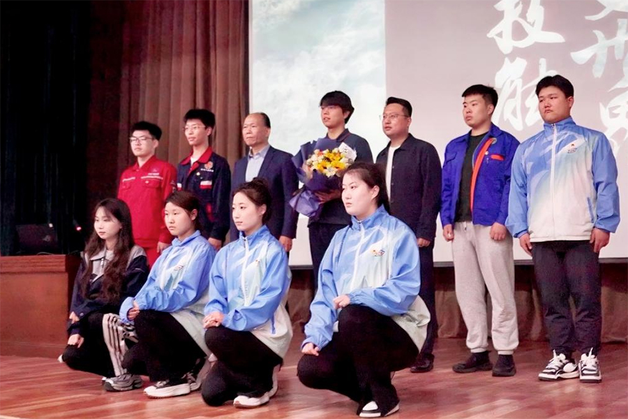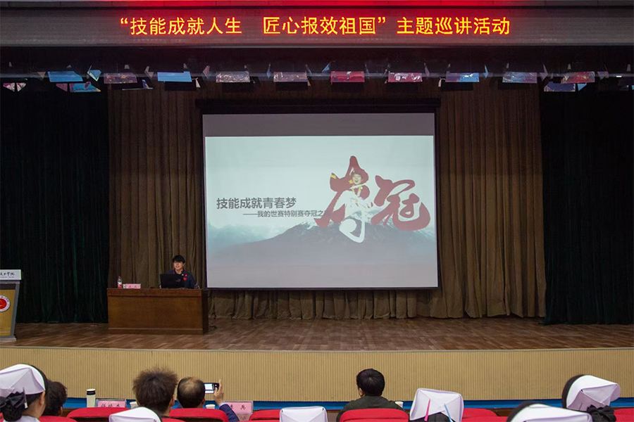当看到颁奖纪录片姜昊老师身披鲜艳的五星红旗,站在世界领奖台的那一刻,全体师生自发响起雷鸣般的掌声,感慨、敬意油然而生。姜昊老师用自己的亲身经历,谱写了一部“技能改变命运”的励志传奇,唱响了一曲“匠心报国”的青春之歌,更展现出新时代青年“强国有我”的使命担当,他的事迹深深感染了在场的每一位师生。