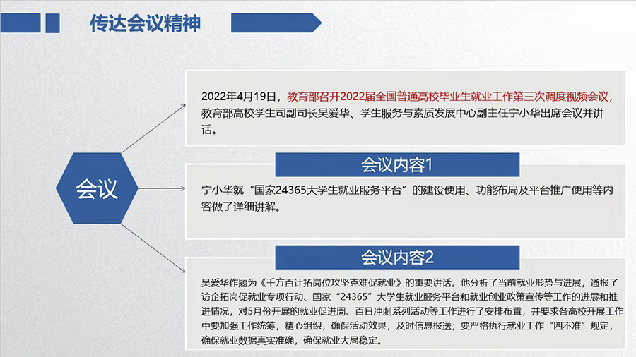 会上,王新处长首先就4月19日教育部2022届全国普通高校毕业生就业工作第三次调度视频会议精神进行传达,并对伟德官网目前就业率统计、访企拓岗促就业专项行动、就业创业政策宣传等相关就业工作开展情况加以说明。