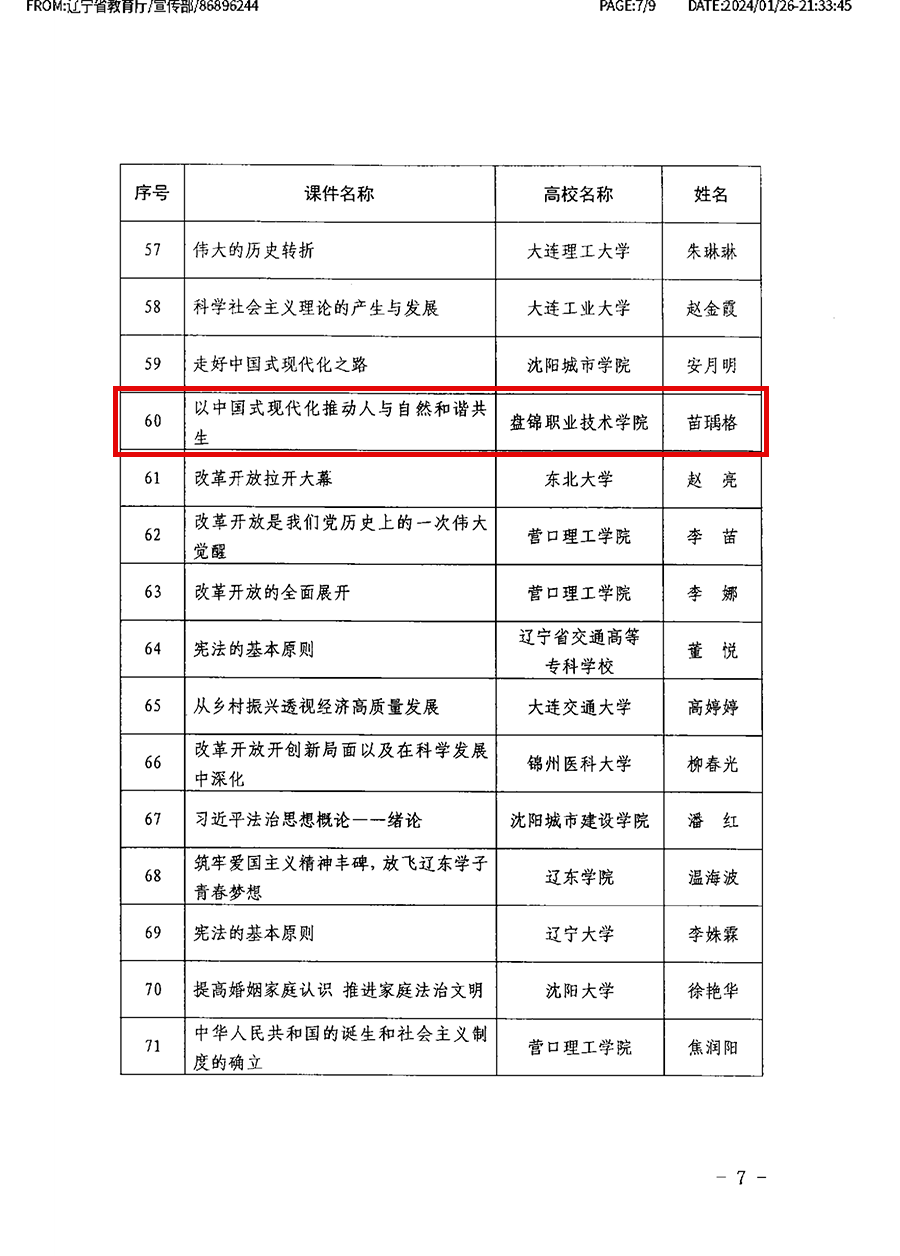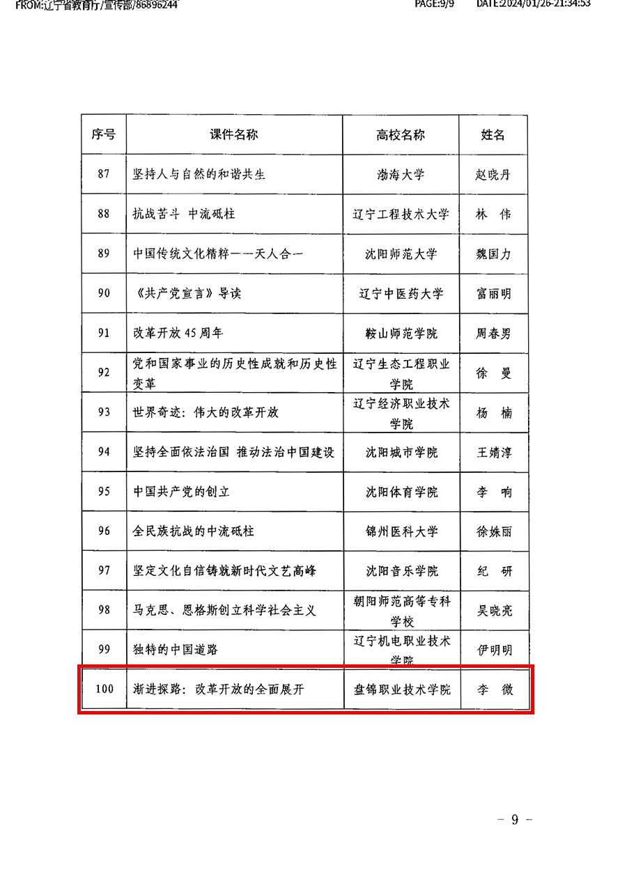 根据《关于组织开展“2023年度辽宁省高校思想政治理论课创优计划”系列活动的通知》要求,省教育厅组织开展了辽宁省高校思想政治理论课选择性必修课精品课件评选工作。经个人申报、学校推荐、专家组评审、会议审议等环节,评选辽宁省高校思想政治理论课选择性必修课精品课件100个。其中,伟德官网思政教研部思政课教师李微申报的《渐进探路:改革开放的全面展开》、教师苗瑀格申报的《以中国式现代化推动人与自然和谐共生》,在此次比赛中获奖。