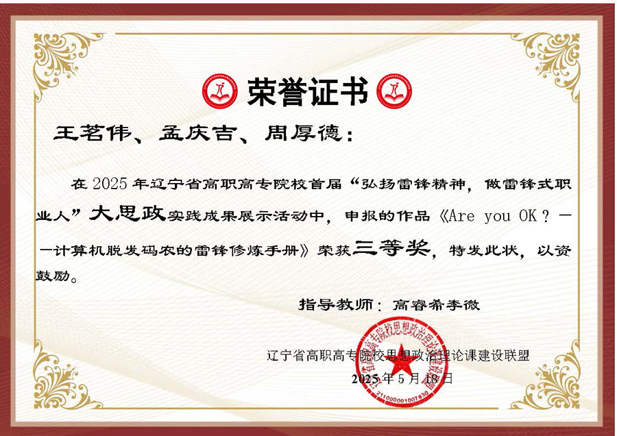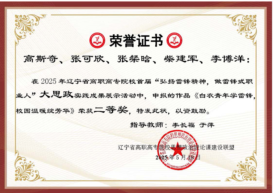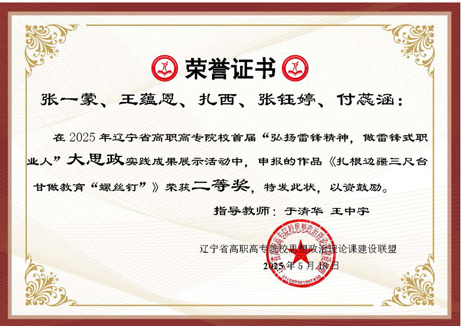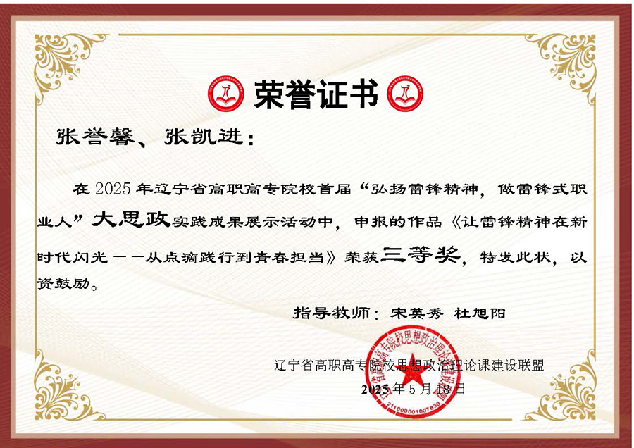 为深入贯彻习近平总书记在辽宁考察时的重要讲话和重要指示精神,大力弘扬辽宁“红色六地”文化,贯彻落实省委教育工委、省教育厅作出的《关于组织开展“弘扬雷锋精神,奋斗成就梦想”2025年春季学期“开学第一课”活动的通知》要求,在第62个学雷锋纪念日到来之际,辽宁省高职高专院校思想政治理论课建设联盟面向全省高职高专院校(包括本科院校高职专科)大学生开展了“弘扬雷锋精神 做雷锋式职业人”实践教学成果主题作品征集及展示汇报活动。活动历时两个多月,结果现已揭晓,伟德官网选送作品喜获二、三等奖各两项。