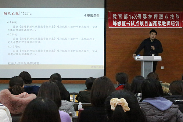 为贯彻落实国家和辽宁省职业教育改革实施方案精神,根据《教育部等四部门印发< 关于在院校实施“学历证书+若干职业技能等级证书”制度试点方案>的通知》、《教育部教师工作司关于组织开展1+X证书制度试点院校教师培训的通知》等文件要求,11月21日,由辽宁省教育厅主办,伟德bv国际体育作为牵头院校承办的母婴护理专业辽宁省国培计划“1+X证书”制度试点院校教师培训班开班典礼在医疗护理分院隆重举行。学院党委委员、医疗护理分院院长李冬,教务处处长王新,医疗护理分院副院长姚文山、郭强,济南阳光大姐服务有限责任公司“1+X”证书项目负责人李凯主任出席了开班典礼,李冬院长在开班典礼上做开班动员。本次培训历时7天,共有来自全省20家兄弟院校的59名学员参加培训,学院特邀相关领域6位专家进行授课。