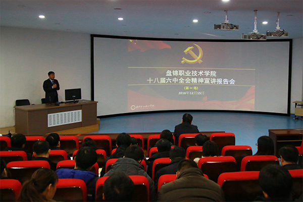 12月15日下午,学院在博远楼103报告厅召开了十八届六中全会精神宣讲报告会。学院党委书记王正东同志为全体党员做了关于“释放从严治党最强音”的专场报告,拉开了学院全面宣讲十八届六中全会精神的序幕。按照市委宣讲工作的总体工作部署,学院领导班子在完成了自学、集体学习、专题研讨等工作之后,就紧锣密鼓的安排下一步宣讲工作。今天的报告会就属于宣讲工作的一个开始,本次报告从十八届六中全会的重大意义、核心要义、学院下一步工作三个部分对十八届六中全会的精神实质及学院工作安排进行了详细的解读。使全体党员干部对于十八届六中全会的精神要义有了一个整体性的认识与把握。