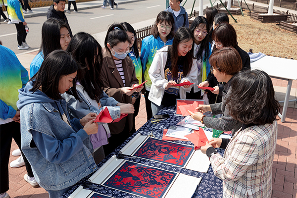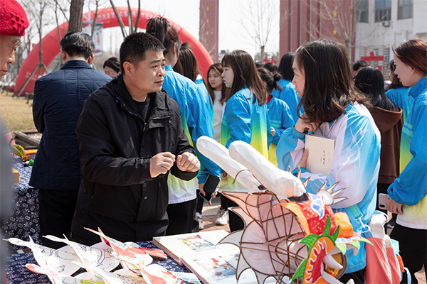 在活动现场,师生们认真地观看非遗项目传承人的操作手法,传承人则耐心地解答着师生们提出的问题。