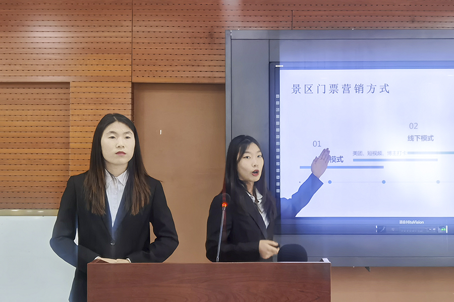 实训最后两天,主要进行了景区运营、景区导游讲解以及虚拟景区运营等实训活动。同学们以小组为团队,分工协作,完成虚拟景区构建,并按照景区部门职能,完成了虚拟景区的PPT展示及讲解介绍,以及对景区纪念品的产品推介。
