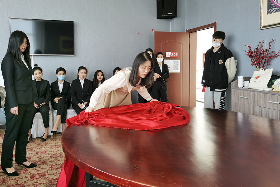 实训第二天,主要由胡文静老师带领同学们进行了前厅接待礼仪、中餐接待礼仪以及西餐接待礼仪的实训。实训以工作过程为导向,同学们全程模拟前厅及中、西餐顾客接待流程,并重点学习了引客入位、托盘斟酒以及餐厅铺台等礼仪技能,同学们学习兴趣浓厚,收获满满。