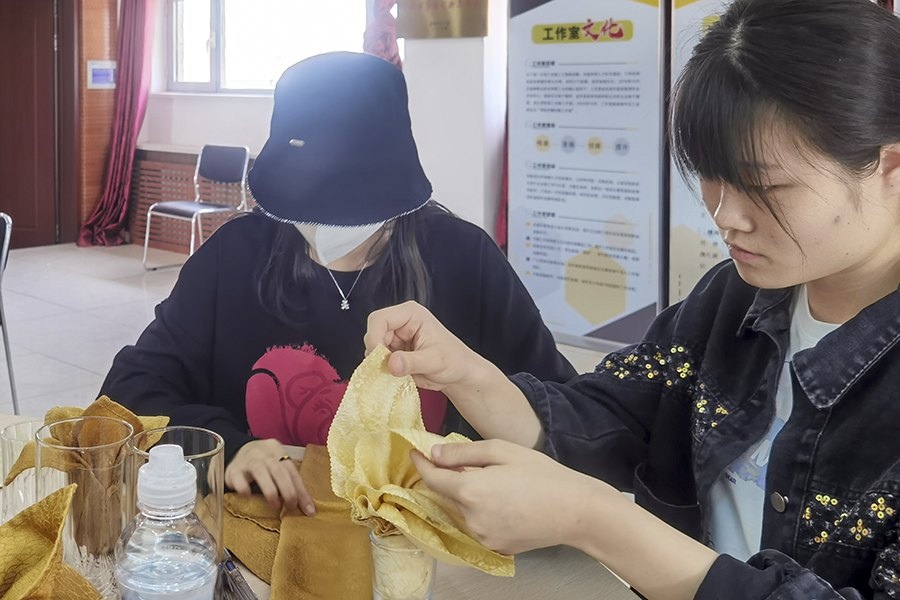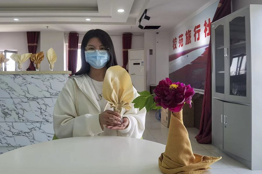 实训第三天,同学们进行了虚拟中餐摆台、虚拟西餐摆台和餐巾折花的实训。同学们通过虚拟模拟软件,认真且成功地完成了中西餐摆台训练,并掌握了六种花型餐巾折花的技能。整个实训过程,同学们认真、专注并且勤于练习,展现出了旅游学子的良好素养。