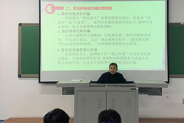 4月27日下午,学院安全保卫处在博远楼102阶梯教室组织全体校卫队员开展防电诈安全知识讲座。讲座由安全保卫处胡鹏处长主持,外勤干事吕俊孝讲授。驻校民警董宝江和付鹏参加此次活动...